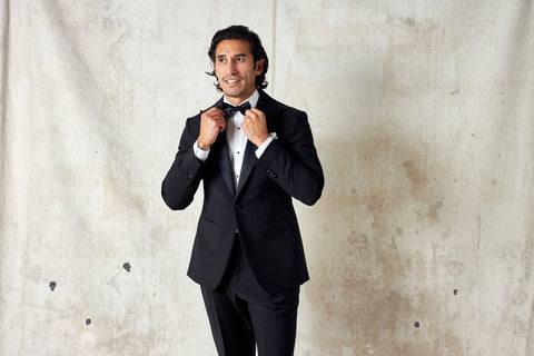 クラシックな、黒のシルクの表面を備えた黒のウール/モヘアのディナー スーツ。人工光の下では黒よりも黒く見えると言われているミッドナイトブルーを選ぶ人もいるかもしれませんが、どちらでも問題ありません。これは、私たちの大多数がブラックタイのイベントに参加するときに行うものです。シンプルで洗練されていて、とてもエレガント。ここではピークドラペルでカットしていますが、ショールドラペルでも同様に機能します。シルクの蝶ネクタイ、白いポケットチーフ、黒いスタッズ付きのドレスシャツ、そしてよく磨かれたオックスフォードを合わせれば準備完了です。