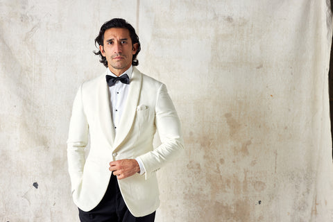 もっと冒険してみませんか?黒のジャケットをオフホワイトのベルベットのジャケットに交換して、さらに注目を集めましょう。私たちは、シャツとのコントラストが良く、少し控えめな(ある種)白であるため、純粋な白よりもオフホワイトを好みます。同じアクセサリーが適用され、ご覧のとおり、今回は共布のショール ラペルを選択しました。コントラストのあるシルクのフェーシングは過剰だと感じますが、これなしでも十分に大胆な外観です。簡単なアドバイスですが、これを着ても大丈夫かどうか必ずイベントの主催者に確認してください。脚光を浴びたり、注目を集めすぎたりすることは望ましくありません。