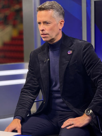 Dave Jones’ illustrious career has made him a trusted voice in football. From presenting pivotal matches to engaging discussions with legends like Micah Richards, Roy Keane, and Daniel Sturridge, Dave is synonymous with football excellence. Our partnership began after creating bespoke suits for iconic footballers Darren Bent and Ian Wright, and we were thrilled to extend our craftsmanship to a presenter of Dave’s stature.