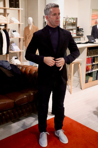 We chose an exceptional made-to-measure corduroy jacket crafted from luxurious Loro Piana cloth, paired with extra-fine merino wool mock neck knitwear. This combination exuded sophistication while offering the flexibility and comfort needed for hours in the studio. The rich texture of the cord jacket added depth, while the merino knitwear provided a modern, stylish twist.