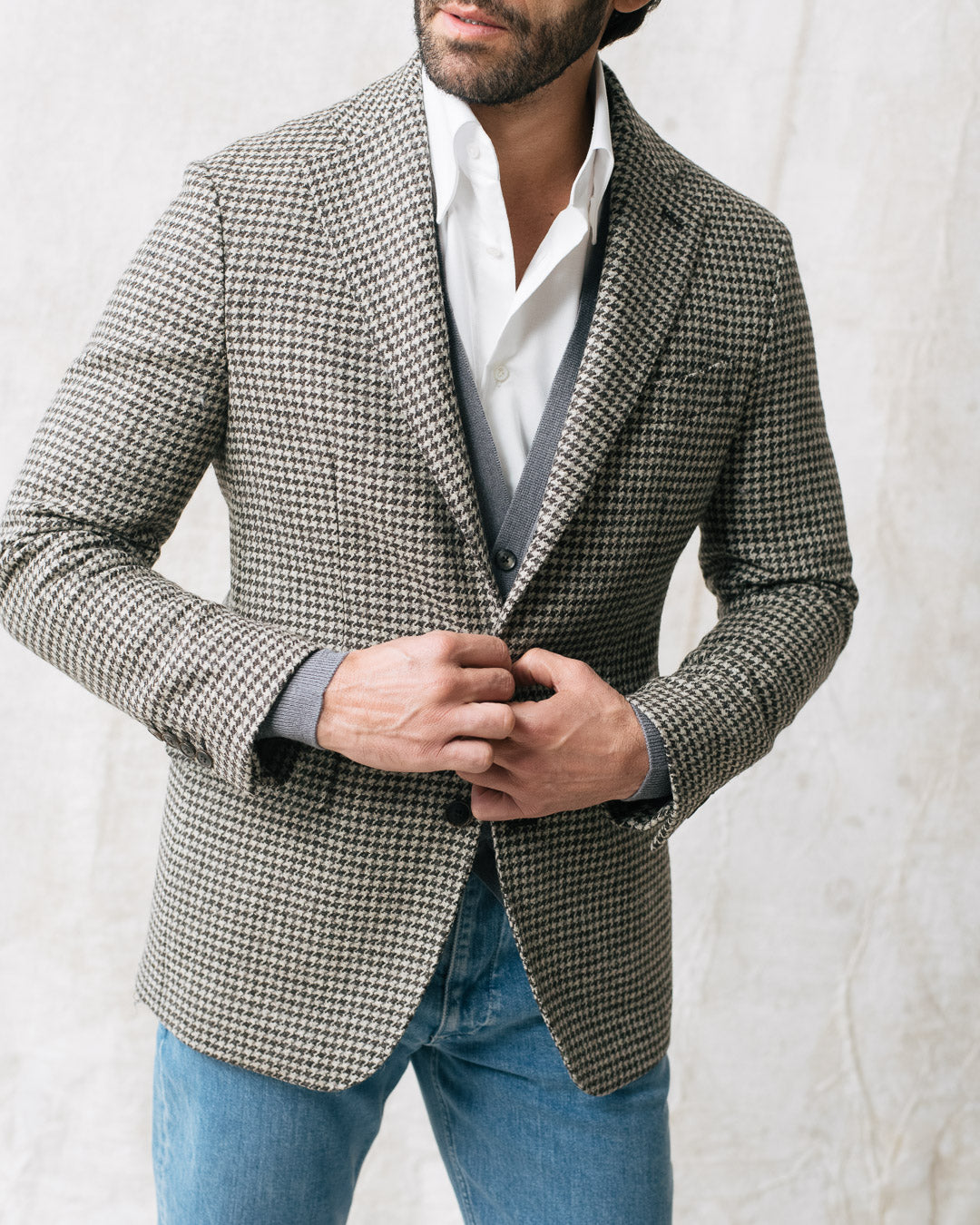 Jackets are only made in a full canvas construction using the finest materials and trimmings. Our aim is to cut a balance between a contemporary fitting jacket with all the elements of classic tailoring. We only work with the most renowned and prestigious fabric mills, weavers and merchants from Italy and Britain. Our collection of jacketing cloths is one of the most extensive on the market, with anything from tweed, soft merino wool and silk blends to linen, baby camel hair, baby alpaca and cashmere available.