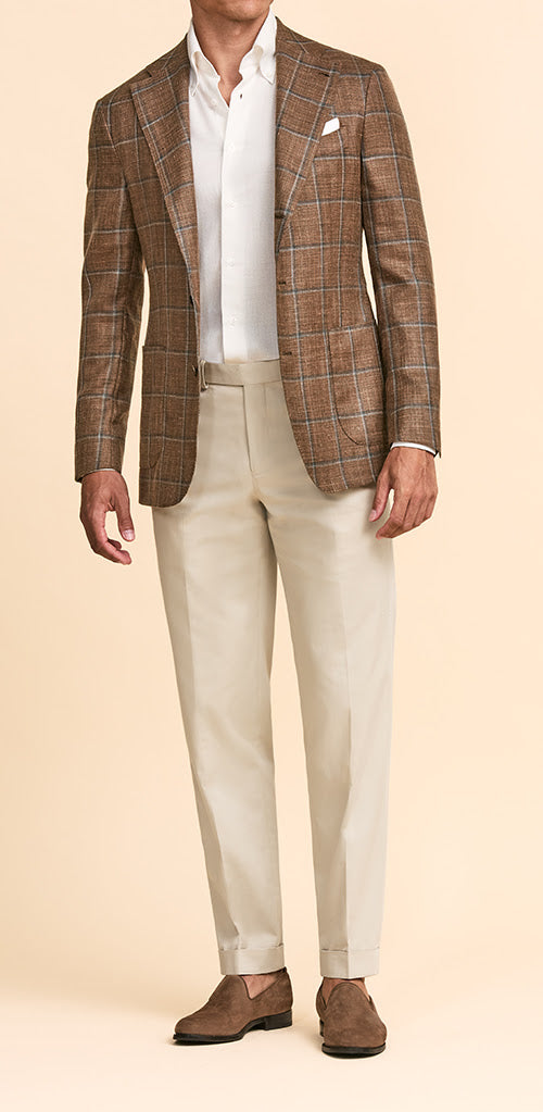 From light taupe to chestnut, brown-toned tailoring adds depth and personality without ever being too loud. Perfect for a sun-filled wedding or garden party, this timeless slate blue glencheck jacket—cut from luxurious Loro Piana fabric—is best worn with a crisp white shirt and chocolate brown suede loafers.