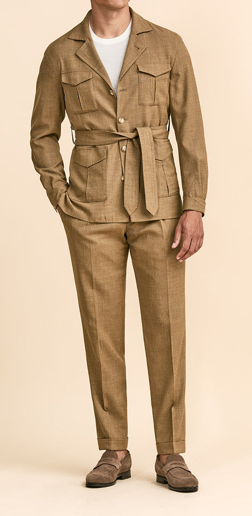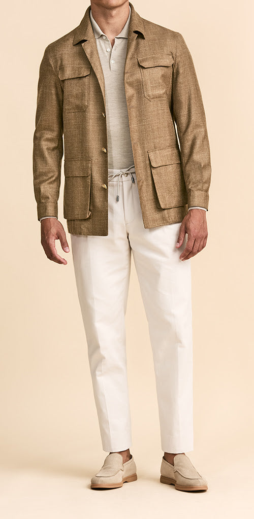 This variation of the caramel safari look leans even more into warm-weather ease. The wool-silk-linen twill delivers texture and depth, while the drawstring trousers and knitted polo offer a relaxed yet refined outfit, perfect for weekend events or outdoor dining.