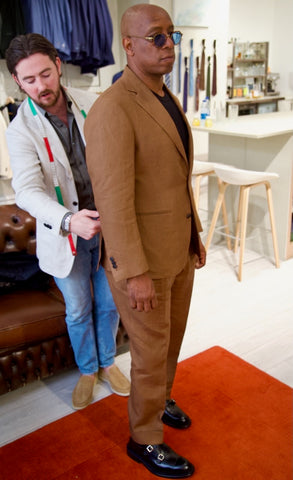 私たちが最初に彼が何を求めているのかについて話し始めたとき、この人が自分のスタイルを本当に理解している人であることがすぐに明らかになりました。彼が何年もかけて磨いてきたもの。伝統的なスタイルの仕立てとモダンなシルエットやストリートウェアを難なく組み合わせる彼の能力は、私たちが彼のアプローチで本当に気に入った点です。物事をシンプルにするために、最初の衣装はもちろんクラシックなシングルブレストのスーツでした。ライティはリネンに少し親近感があるとすぐに言いました。それで私たちはオプションを検討し、英国、イタリア、フランスのリネンの豊富なコレクションから束をめくり始めました。 。すぐに、ダグデールの新しい家宝の束から、素敵な重みと素晴らしいドレープを備えたゴージャスなタバコブラウンのアイリッシュリネンを見つけました。彼はまた、英国の織物と繊維産業をサポートすることを本当に断固として喜んでいた(なんて人だ)。